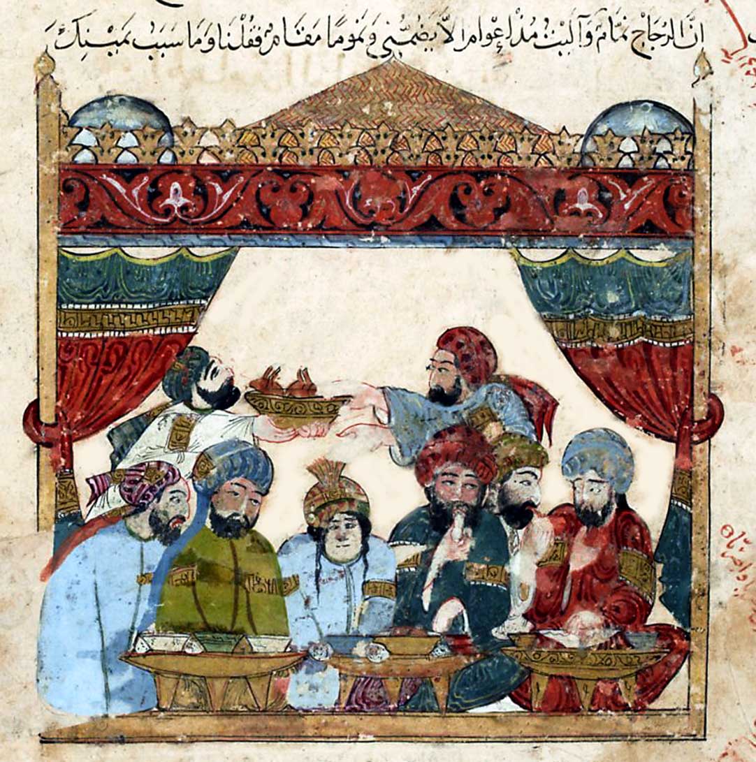 [Ilustración de al-Hariri de Basra que reimagina un banquete del periodo de la dinastía abasí de Bagdad (750-1258). En: al-Hariri. (c S.XII-XII). Al-Harīrī’s Maqāmāt.]